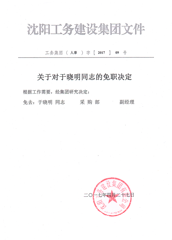 工務(wù)集團(tuán)(人事)字【2017】09號《關(guān)于對于曉明同志的免職決定》