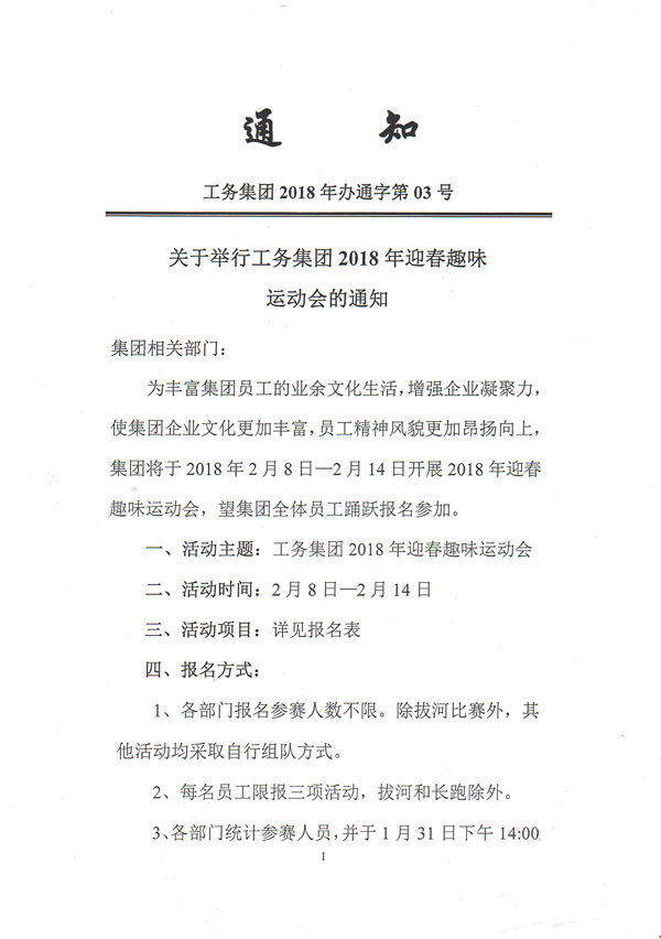 工務集團2018年辦通字第03號《關于舉行工務集團2018年迎春趣味運動會的通知》
