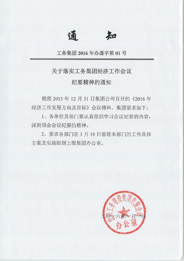 工務集團2016年辦通字第01號《關于落實工務集團經濟工作會議紀要精神的通知》