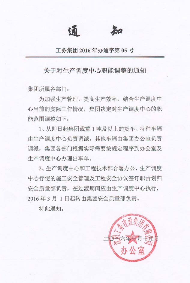 工務集團2016年辦通字第05號《關于對生產調度中心職能調整的通知》